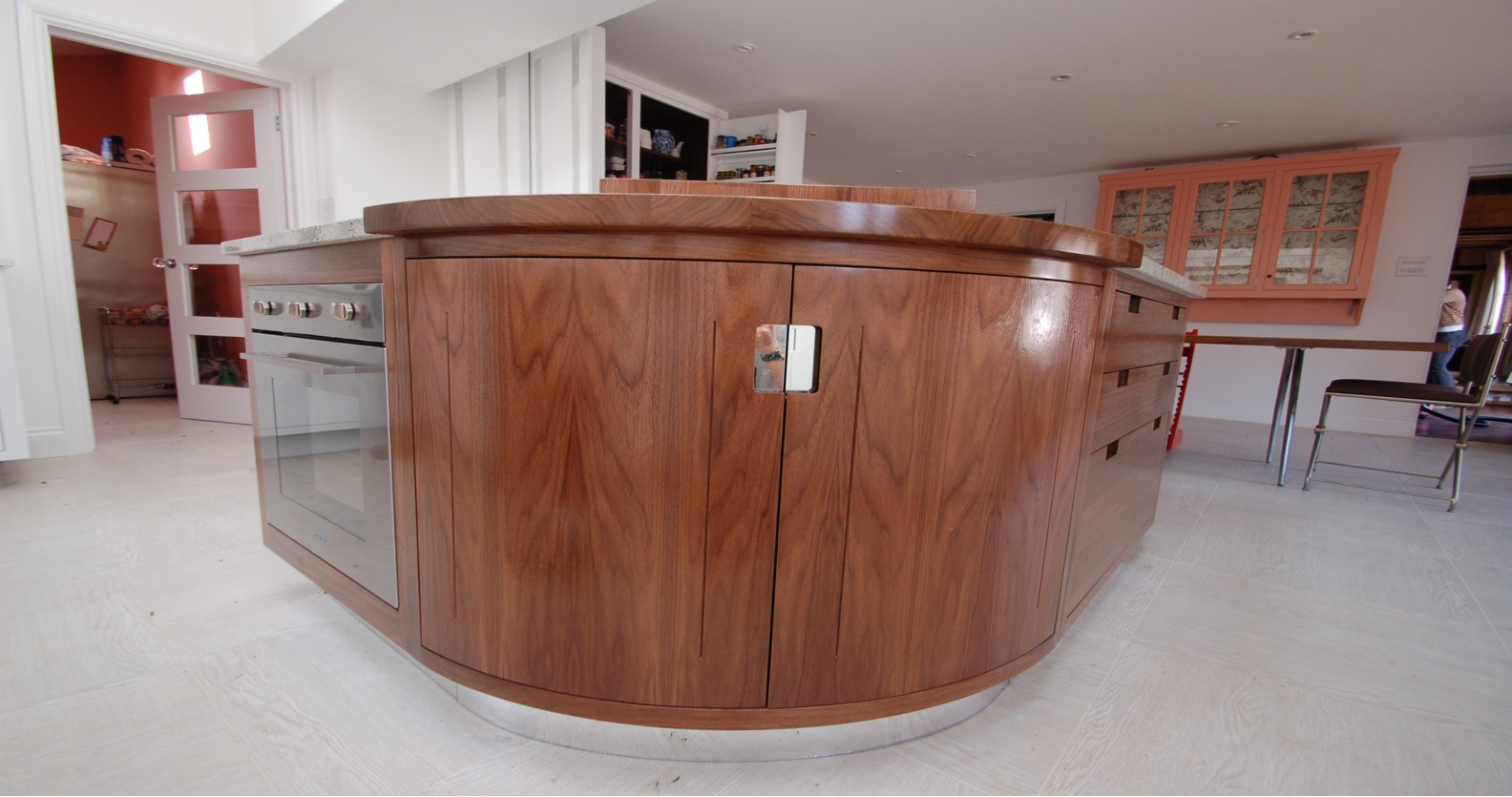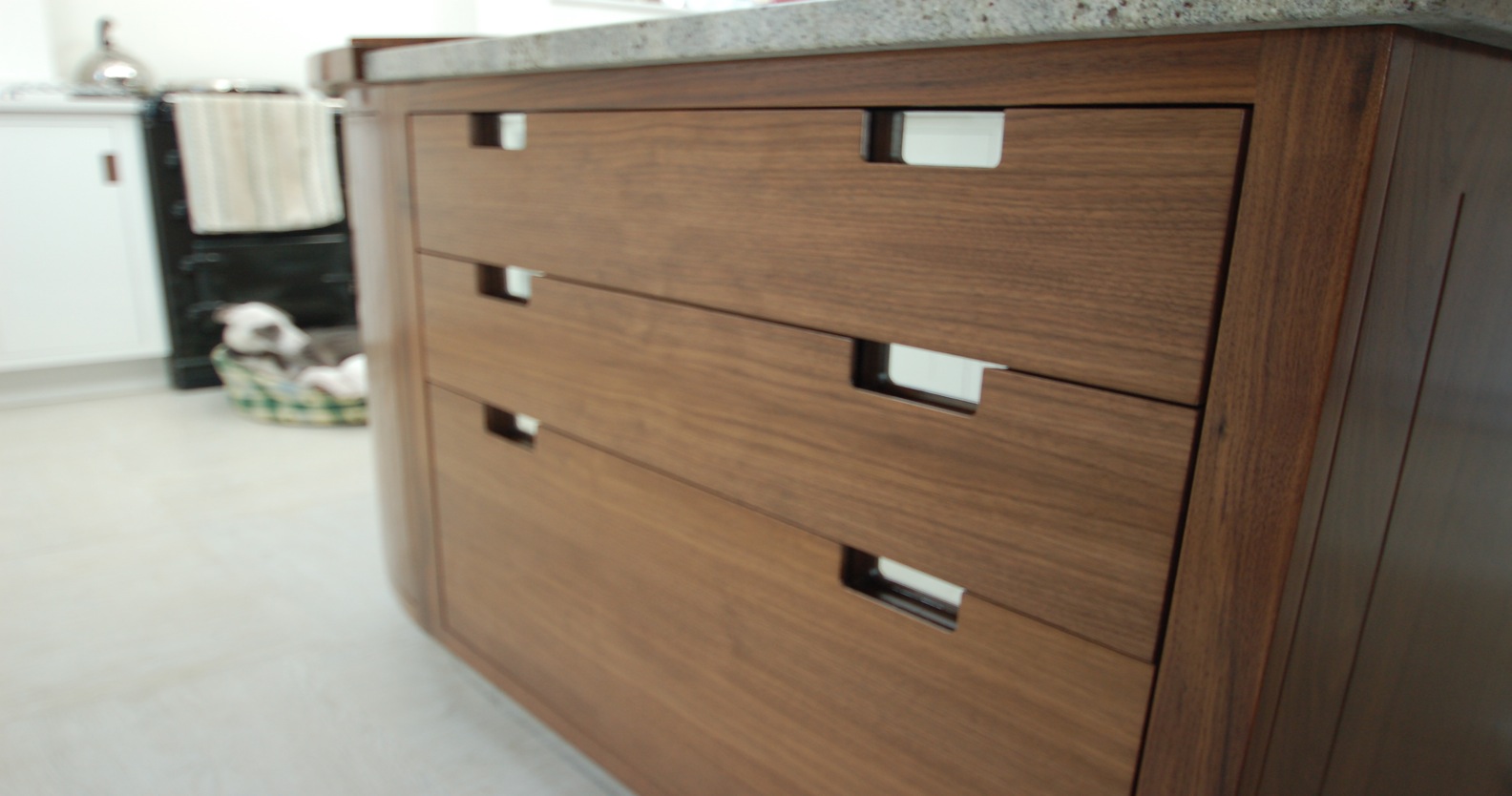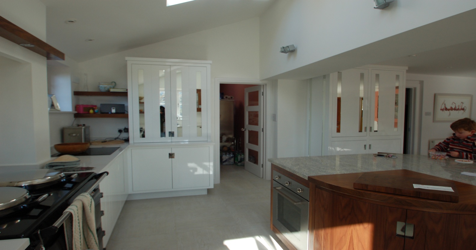 The warmth and depth of the Walnut provided a contrast to the sleek white cupboards.