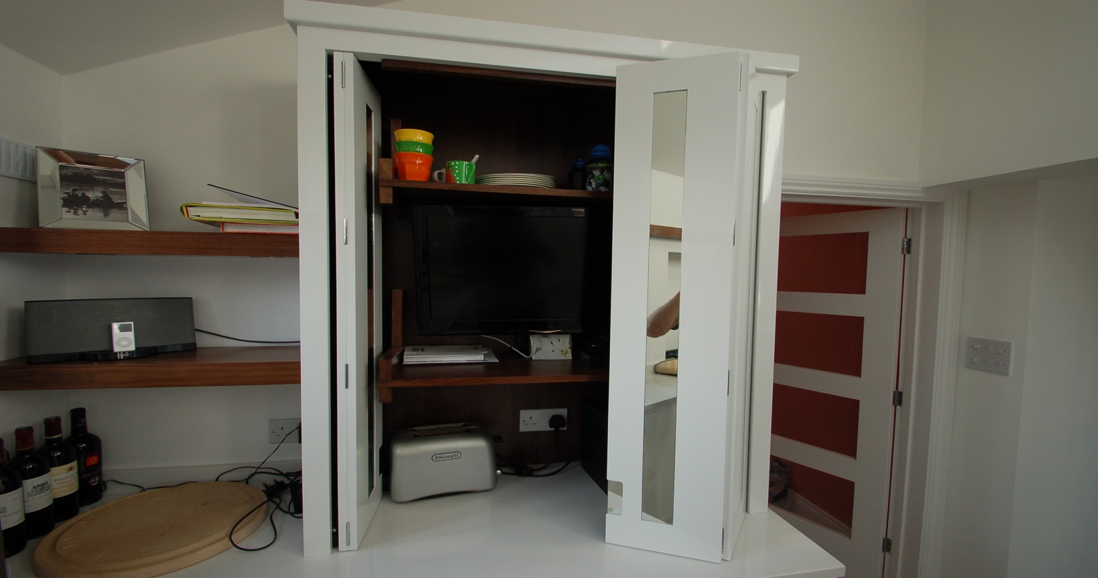A cupboard fitted with pocket doors (a sliding door that disappears when fully open into a compartment in the adjacent wall) provided access to a concealed working area for small kitchen equipment with a television and shelving above.